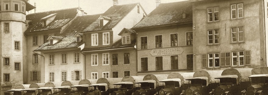 Der motorisierte öffentliche Verkehr begann in der Region Zofingen am 10. Juni 1905 mit der Aufnahme von Probefahrten auf der Strecke Aarburg-Zofingen-Brittnau. Bereits am 5. April 1906 fand die Gründungsversammlung der Automobilgesellschaft Zofingen statt und am 5. Mai startete der Betrieb mit 6 Kursen täglich. Im Ersten Weltkrieg wurden in Zofingen militärische Einquartierungen mit Armeefahrzeugen vorgenommen – so z.B. 1918, als auf dem Thut-Platz ein Saurer-A-Wagen-Fahrzeugpark entstand (siehe Bild).